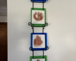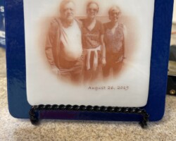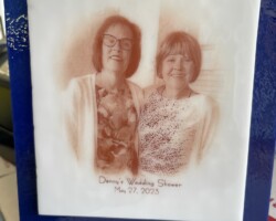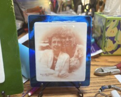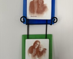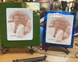 Using a photograph, an inexpensive laser printer, and special transfer paper, the image is first printed onto the paper and then transferred onto a piece of white fusible glass. This white glass is then layered onto a piece of colored fusible glass and fired in a kiln. It’s important to use a kiln with precise temperature control to ensure proper fusion and image quality.
